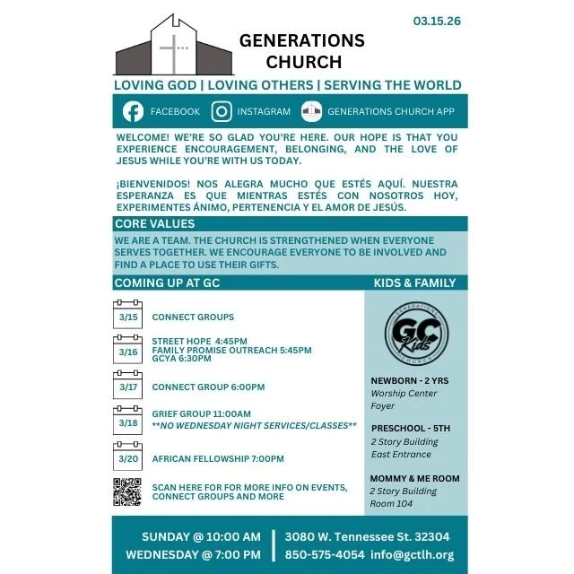 Generations Church, 3080 W Tennessee St, Tallahassee, FL, 32304, United States850-575-4054info@gctlh.org